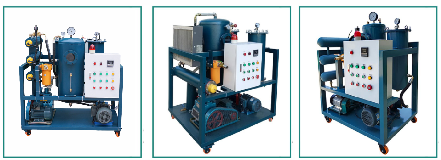 The vacuum oil purifier is designed based on the principle that the boiling points of water and oil are different. It consists of vacuum heating tank, primary filter, fine filter, water tank, vacuum pump, oil drain pump and electric control box.